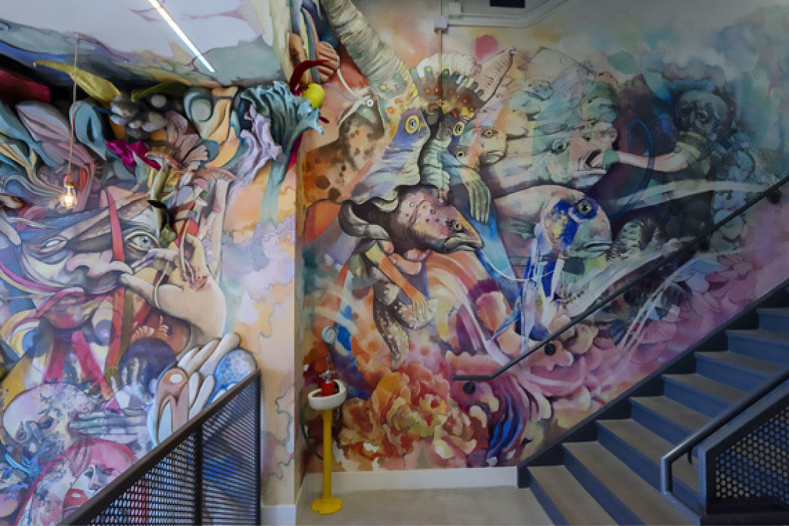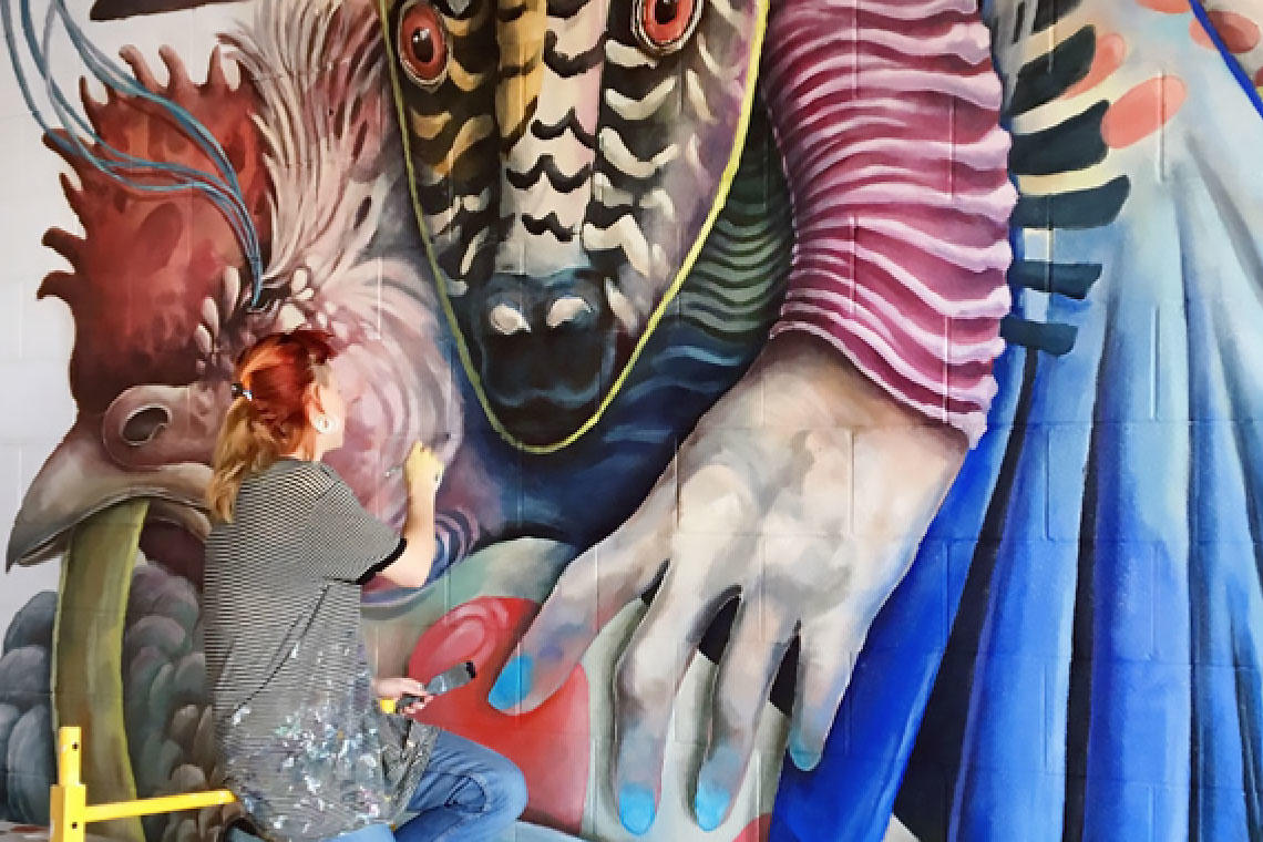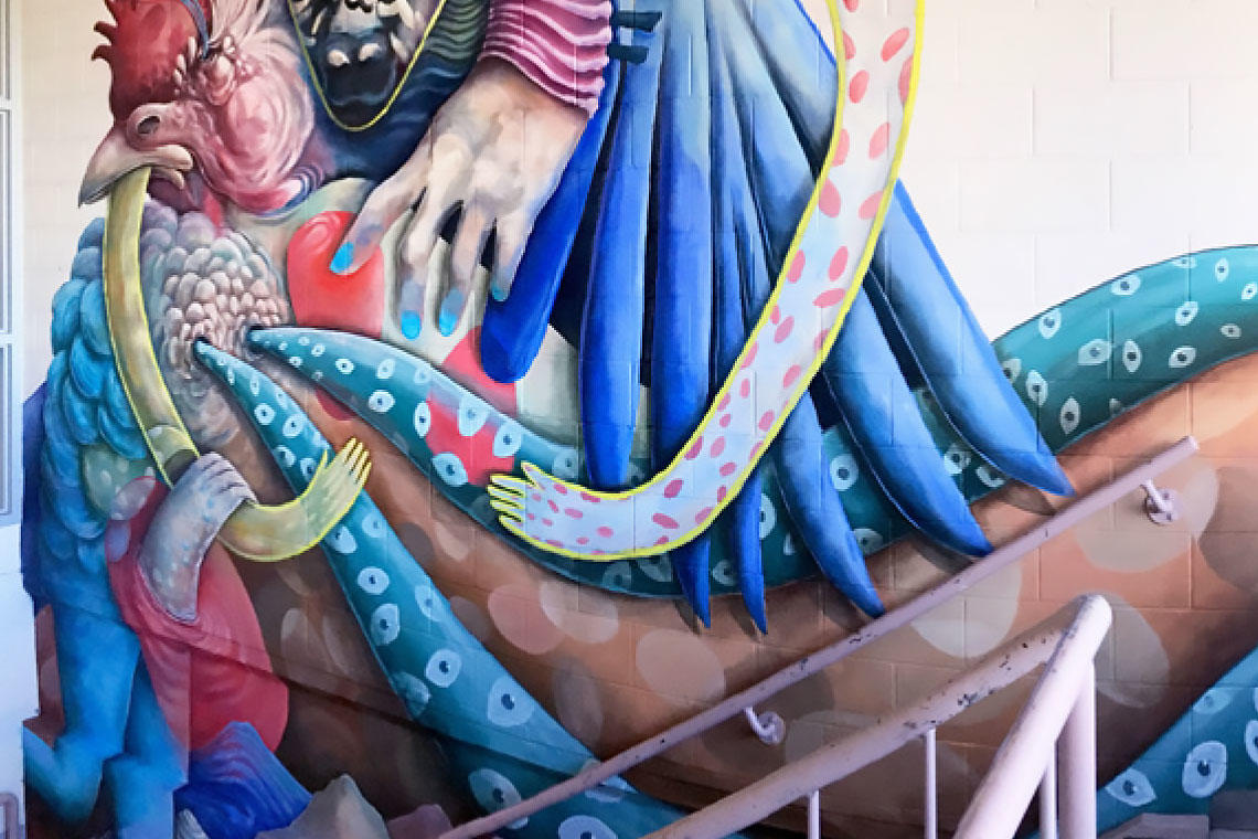 Behind the elegant tangles of human limbs sprouting out of animal heads — seen in Calgary’s Beltline Urban Mural Project (BUMP), the stairwell at cSPACE or the entrance to UCalgary’s Art department — the subject matter behind this recent graduate’s murals reflects her fascination with our primal/animal selves. And the intricate details Green brings to all her work is directly connected to the access she had to a biology lab while studying fine arts at UCalgary.