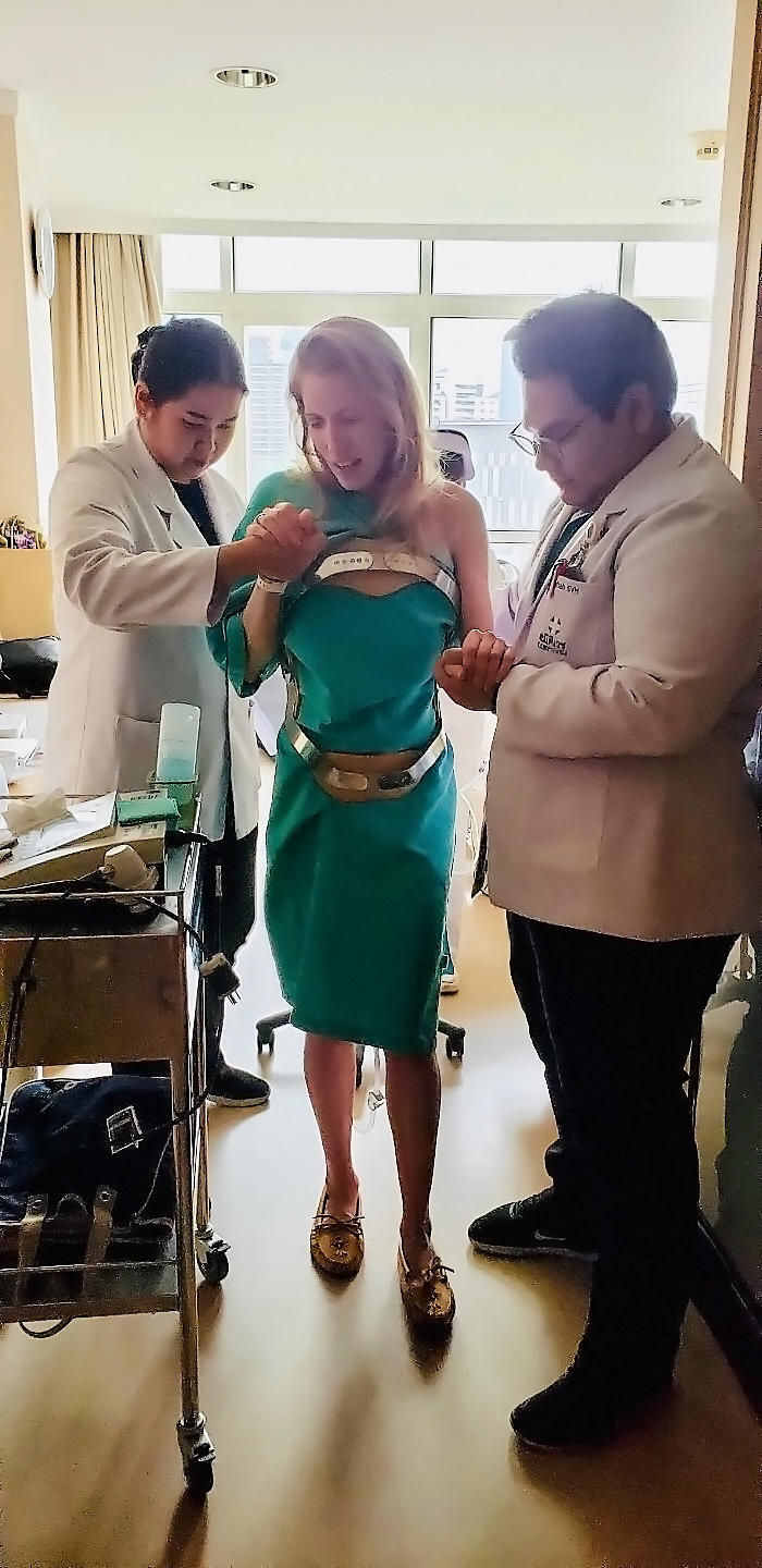 While she did not need surgery — despite losing a full inch in height and developing scoliosis — Russell was fit with a restrictive upper-body brace she had to wear for four months, which she could not put on by herself.